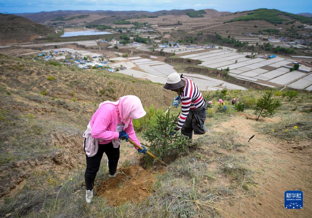 5月18日,人们在宁夏固原市西吉县硝河乡栽植云杉。新华社记者 冯开华 摄