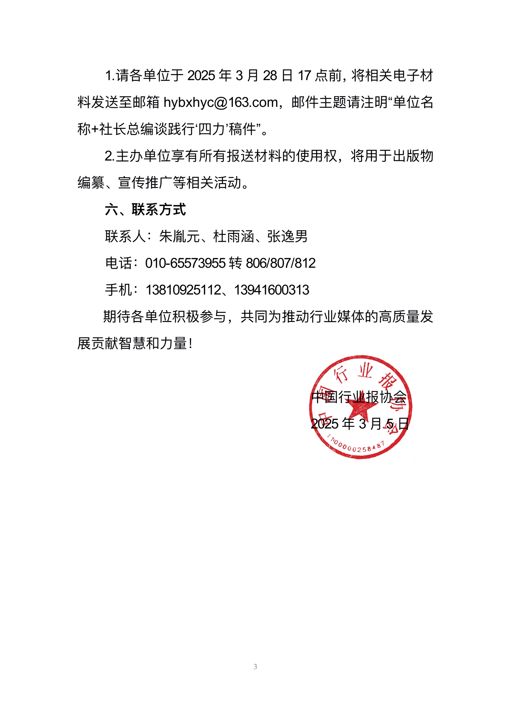 1.请各单位于2025年3月28日17点前,将相关电子材料发送至邮箱hybxhyc@163.com,邮件主题请注明“单位名称+社长总编谈践行‘四力’稿件”。