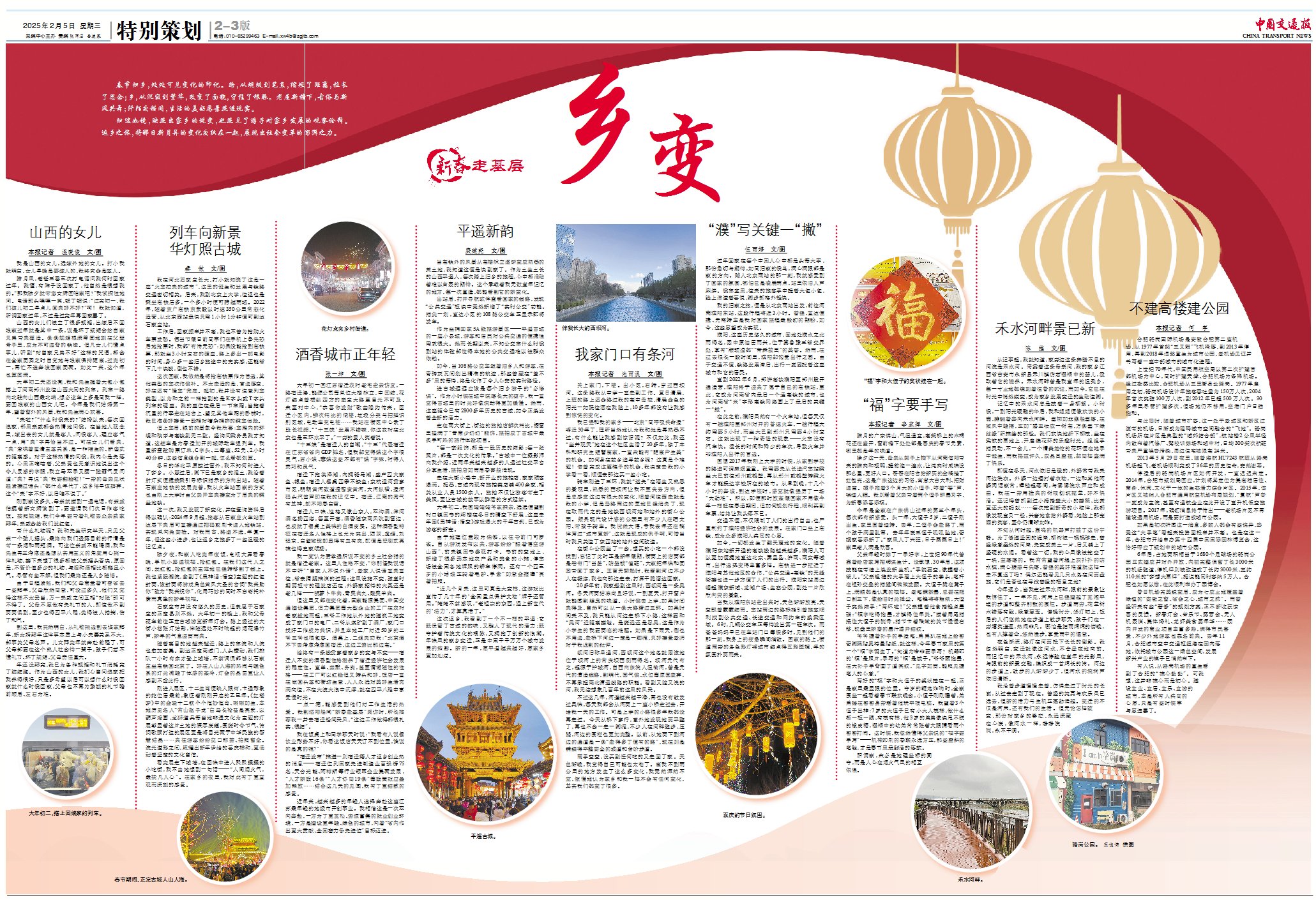 春节期间,报社还策划了《乡变》特别报道,报社9名记者利用春节假期返乡探亲和外出旅游机会,从山西平遥、河北石家庄、江苏宿迁、河南濮阳、广东佛山、安徽合肥等地发回特别报道,推出《平遥新韵》《禾水河畔景已新》《“福”字要手写》等作品,记录家乡蜕变,展现乡风民俗、乡村治理、生产生活等方面的新变化。