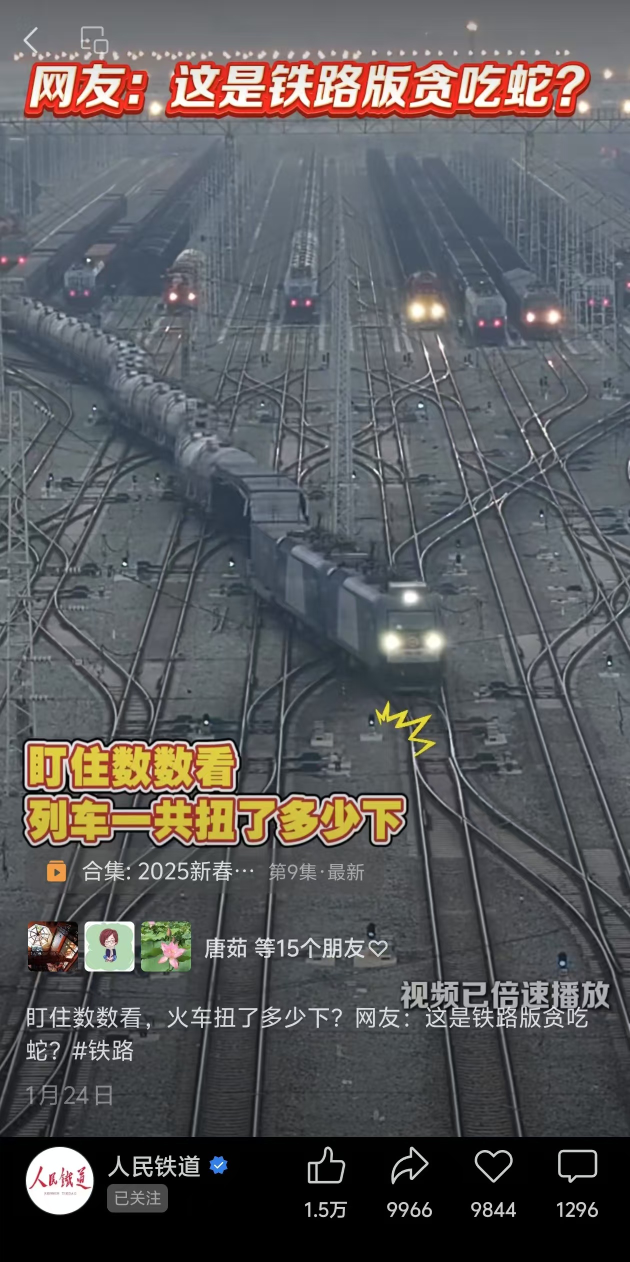 (二)用新年的视角看。结合蛇年热点,捕捉位于陕西省新丰镇站的编组场内,火车在钢轨上丝滑“蛇形走位”画面,推出图文视频产品《“蛇形走位”的火车冲上热搜!网友惊叹:怎么这么丝滑?》,展示了春节期间铁路编组站繁忙、钢铁大动脉运输不停的热火场景。一个原本常见的场景结合新年元素,被赋予了新潮的意义,一经推出,迅速火爆全网,并登上微博热搜。目前全网传播量突破5亿人次,主流媒体纷纷转发,140多家媒体同步转发报道。