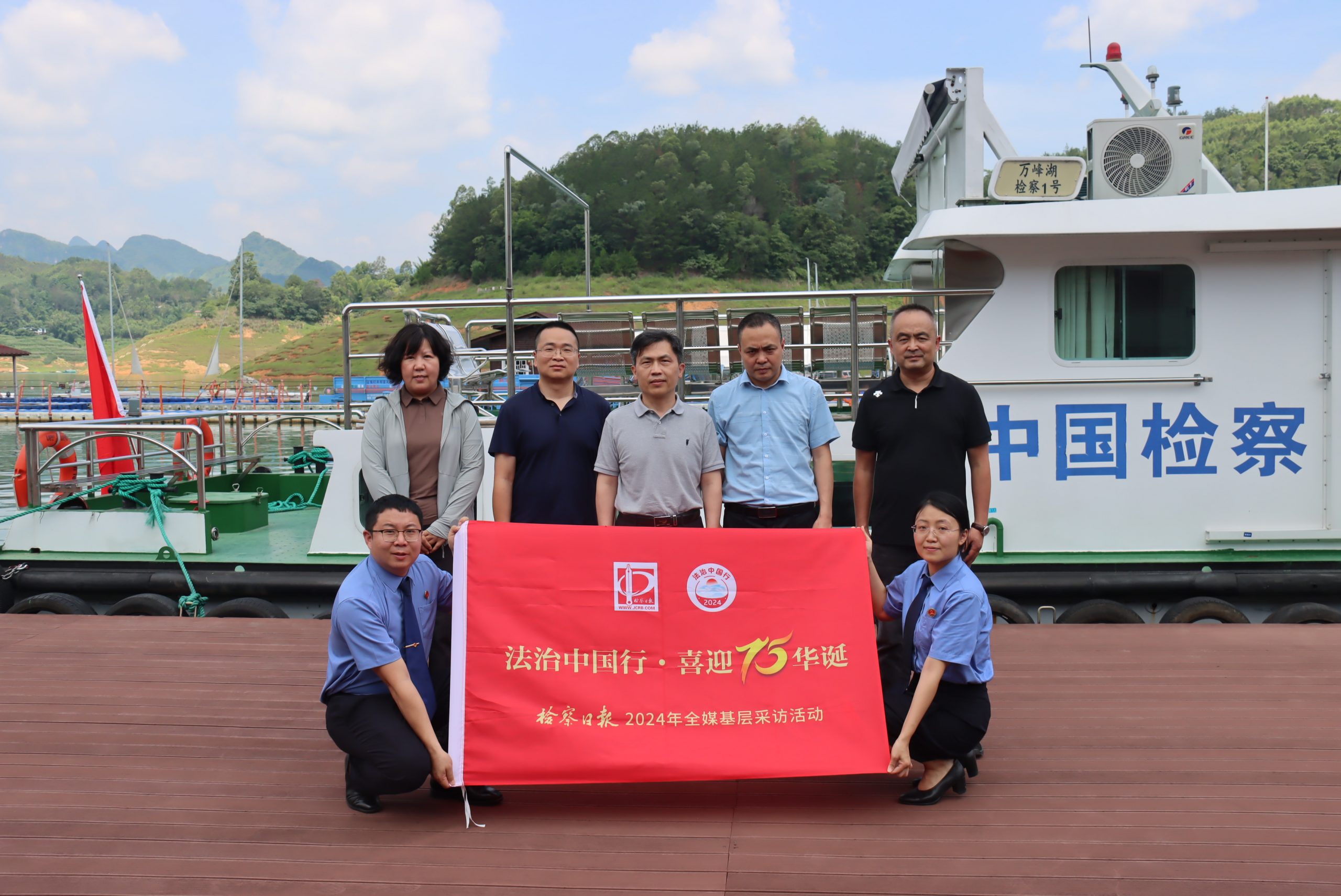 “法治中国行·庆祝新中国75华诞”2024年全媒基层行采访活动中,魏星总编辑带队前往贵州采访。图为报道小组完成对万峰湖联合水上检察室的采访后,与受访者等人合影留念。