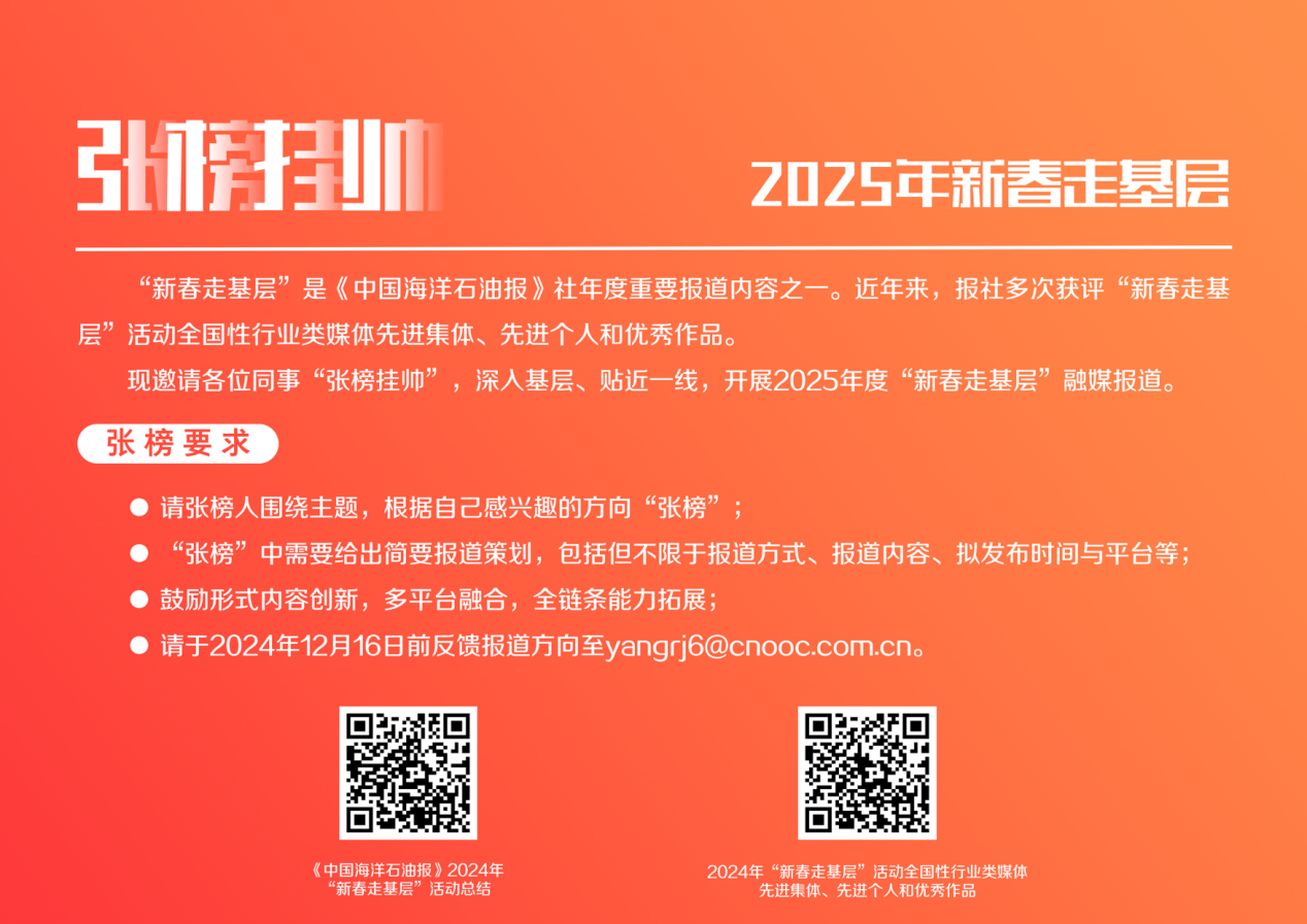 2025年年初,通过“张榜挂帅”机制,18位“张榜”记者组成10个采访组,赴海上平台、建造场地、加气站等具有行业特色的基层一线,围绕保障国家能源安全、大国重器建造进展、海洋能源新质生产力发展、天然气保供民生等主题推出一大批“沾泥土”“带露珠”“冒热气”的新闻报道,记录海洋石油工人碧海丹心,能源报国的奋斗故事。1月14日至2月12日,报社报、网、微、视全平台发力,累计发稿111篇,总点击量超过600万。在刚刚结束的全国性行业类媒体2025年“新春走基层”活动优秀案例评选中,《中国海洋石油报》“新春走基层·走在前 勇争先”融媒体报道团队入选“优秀团队”,视频作品《钻向怒海更深处》入选“优秀作品”。《中国海洋石油报》社成为同时摘得“优秀团队”和“优秀作品”奖项的8家单位之一。