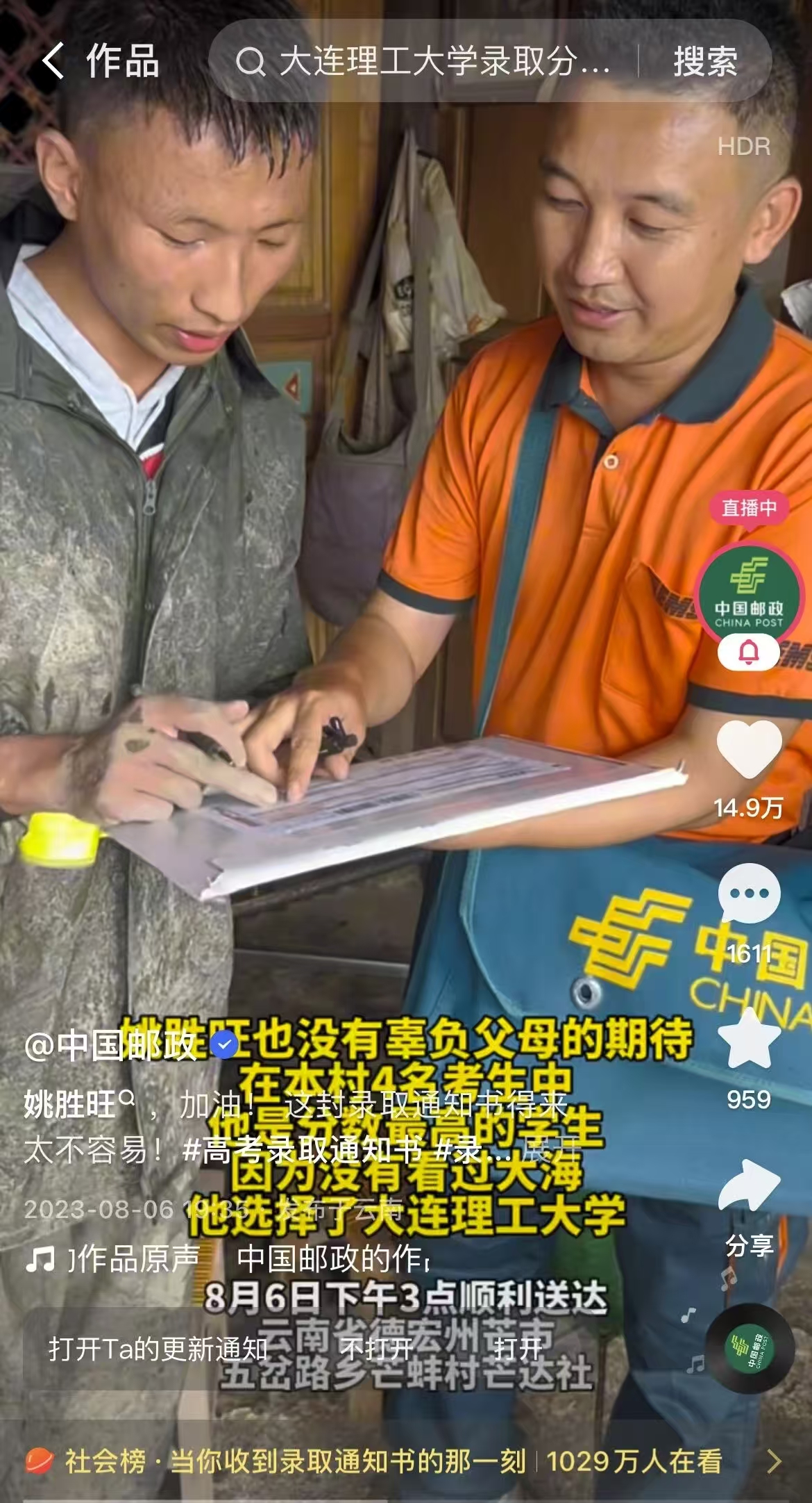 2023年和2024年,报社连续两年在高考季组织开展“一起去送高考录取通知书”直播项目,共举办16场,总时长超40小时,总曝光量超20亿人次。慢直播的形式,让观众以近乎实时的视角,沉浸式感受邮政人精准送达通知书的全过程。其中,云南德宏站“挖姜男孩”姚胜旺的故事感动全网,人民日报、新华社等上百家媒体、平台相继转发报道。在四川凉山站,重走王顺友“马班邮路”一起去送高考录取通知书的直播,全网在线观看量超300万。