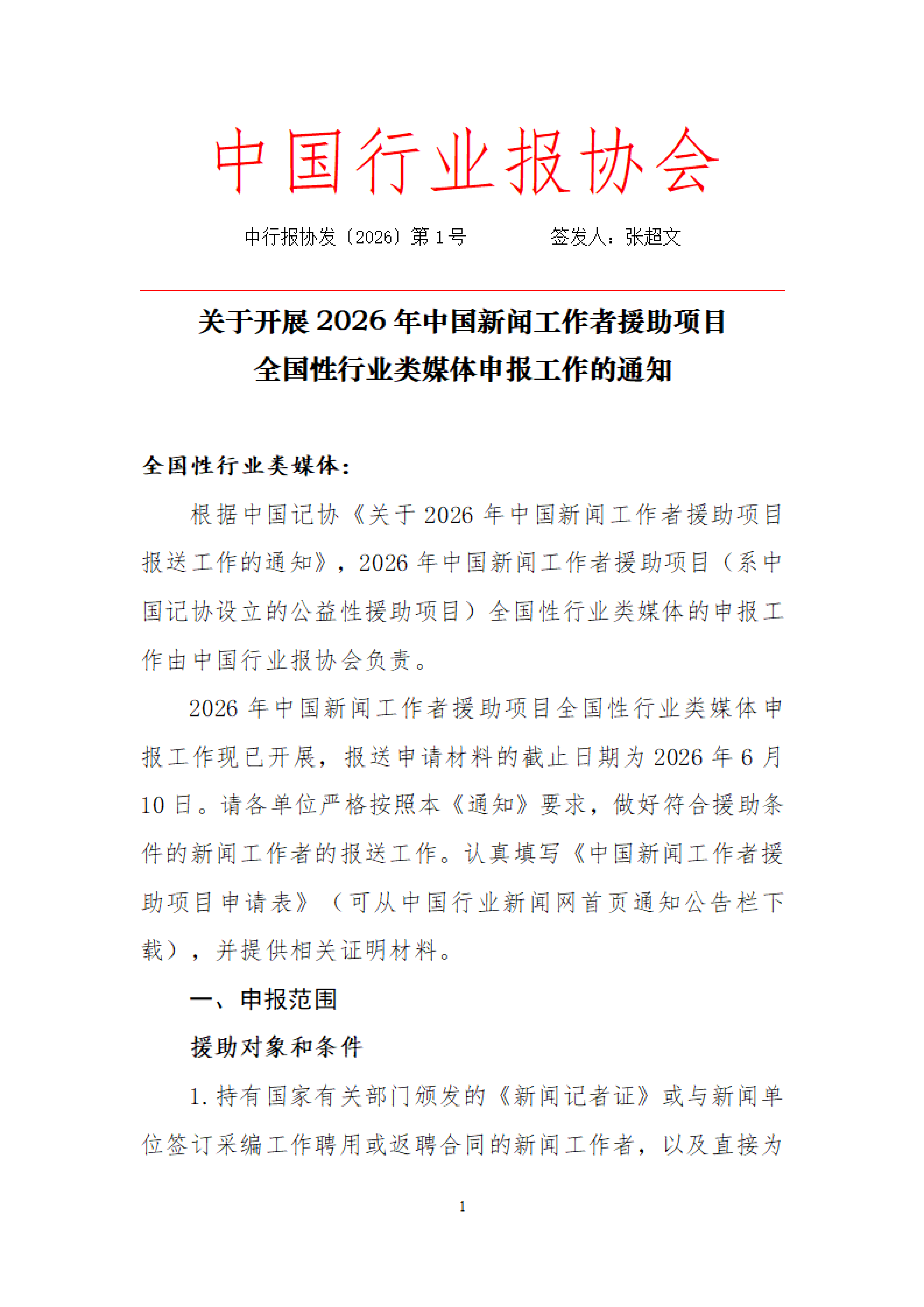 2026年中国新闻工作者援助项目全国性行业类媒体申报工作现已开展,报送申请材料的截止日期为2026年6月10日。请各单位严格按照本《通知》要求,做好符合援助条件的新闻工作者的报送工作。认真填写《中国新闻工作者援助项目申请表》(可从中国行业新闻网首页通知公告栏下载),并提供相关证明材料。