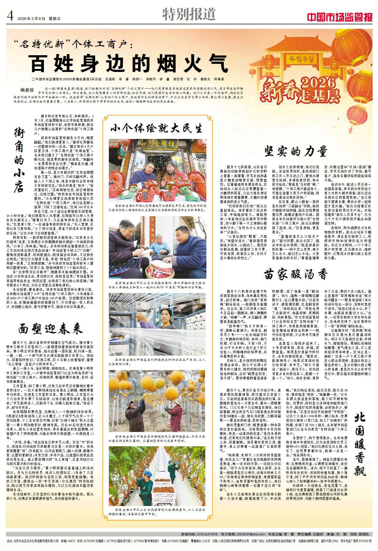 2026年新春,中国市场监管报社紧扣中宣部“新春走基层”工作部署,立足市场监管主责主业,统筹全媒体平台资源,组织采编人员深入一线、扎根基层,全方位、多角度、立体化展现市场监管部门“保安全、稳市场、惠民生”的生动实践,主题宣传有声势、有深度、有温度、有实效。