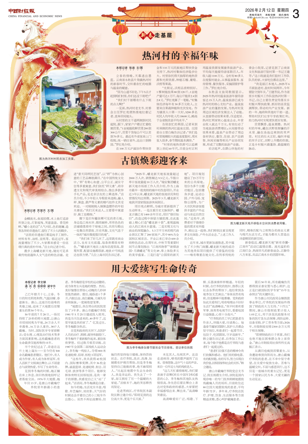 2026年新春,按照中宣部、中国记协工作部署,中国财经报社精心组织开展了“新春走基层”活动。49名编辑、记者深入城镇乡村、工厂车间,足迹遍布大江南北,南至天涯海角、北抵塞北漠河。他们以脚步丈量大地,以笔触记录时代,在锤炼“四力”中,采写出一批沾泥土、带露珠、冒热气的鲜活报道,生动展现祖国各地欣欣向荣、人民群众欢度佳节的喜人景象,唱响了温暖昂扬的时代主旋律。活动期间,中国财经报社所属各类平台共刊播157篇(条),其中报纸发稿68篇、网站发稿70篇,累计推出16个专版、短视频19个,形成了全方位、多层次的传播声势。