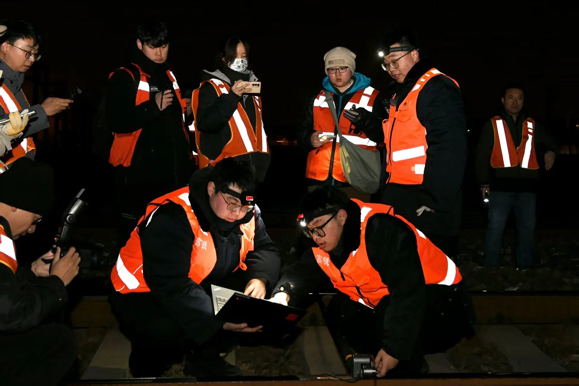 1月30日凌晨,记者们在北京南站采访铁轨打磨小队。
